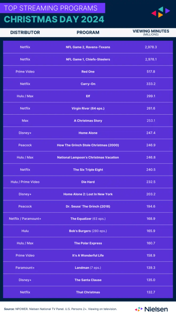 “This is a Christmas story of how all streamers are finding success balancing new and evergreen programming on streaming,” said Brian Fuhrer, SVP at Nielsen. “While live football was the highest profile and most-viewed, the diverse slate of original and classic shows and movies really resonated with audiences.”