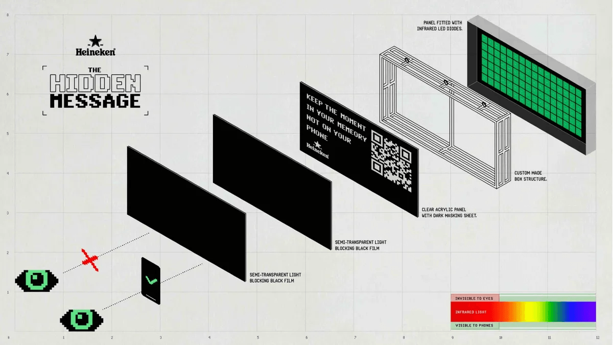 - The beer brand raised awareness for the offering at two events this month: Mexico’s Live Out music festival and the Amsterdam Dance Event. Attendees filming those events received a hidden message on their phone screens to put their devices away, an activation that was executed with help from infrared technology.