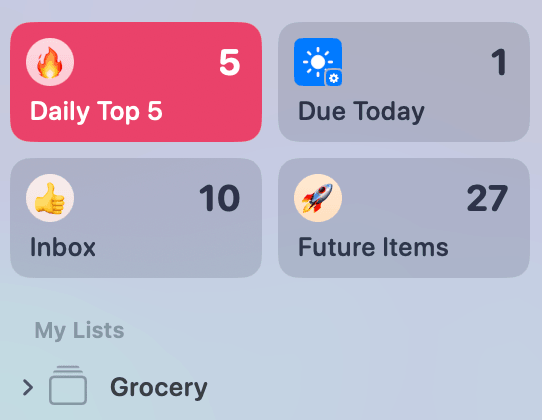 - Daily Top 5 - my holy grail of what needs to get done- Due Today (which needs a better name) - this is where dated and time based items from the Future Items go. It is a smart list so very fluid.- Future Items - This is for bill due dates, subscription reminders, anything with set date and/or time specific.- Inbox - this is where I capture everything. - Grocery - This is a collection of store based lists shared with the family. Not part of my productivity system but a very convenient way to handle these especially with Apple’s build in Groceries List Type.